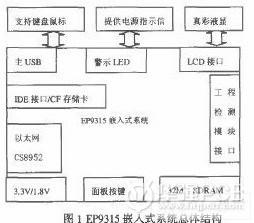 由圖1可見.系統(tǒng)以微處理器EP9315為核心,具有完備的外設(shè)接口功能,同時控制工程檢測儀。IDE/CF卡接口為工程檢測數(shù)據(jù)提供大容量移動存儲設(shè)備;擴(kuò)展32M的SDRAM作為外部數(shù)據(jù)存儲空間;3個主動USB接口支持USB鍵盤鼠標(biāo);LCD接口支持STN/TFT液晶和觸摸屏.為用戶提供友好的交互界面;1/10/100 Mbps以太網(wǎng)為調(diào)試操作系統(tǒng)時下載內(nèi)核及工程檢測時遠(yuǎn)程監(jiān)控提供途徑;面板按鍵為工程人員野外作業(yè)無法使用鍵盤鼠標(biāo)時提供人機(jī)交互接口。