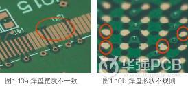 QFP焊盤(pán)形狀及焊盤(pán)之間的距離不一致,焊盤(pán)之間的互連短路設(shè)計(jì),BGA焊盤(pán)形狀不規(guī)則等。如圖1.10a和1.10b所示。