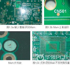 6 、缺少M(fèi)ark點(diǎn),Mark點(diǎn)設(shè)計(jì)不規(guī)范,造成機(jī)器識(shí)別困難。如圖1.3a、1.3b和1.3c所示。