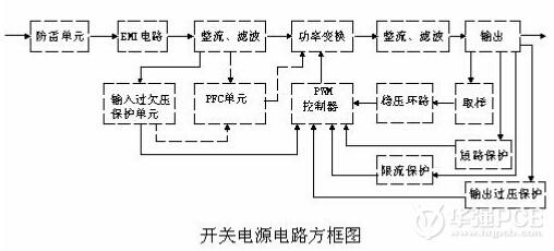 開關電源的主要電路是由輸入電磁干擾濾波器(EMI)、整流濾波電路、功率變換電路、PWM控制器電路、輸出整流濾波電路組成。輔助電路有輸入過欠壓保護電路、輸出過欠壓保護電路、輸出過流保護電路、輸出短路保護電路等。