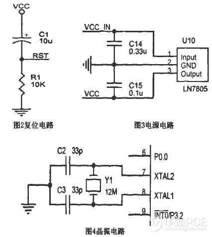 圖2、圖3和圖4分別為復位電路、電源電路和晶振電路。復位電路中的RST網(wǎng)絡標號連接至STC12C5410AD單片機的引腳3,該電路上電復位。由于STC12C5410AD單片機工作電壓在5.5~3.5V之間,因此電源用的是5V的開關電源,為了AD轉換準確,加入了一個LM7805穩(wěn)壓芯片。
