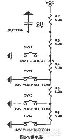 由于Io口資源有限,而STCl2C5410AD自帶AD轉換,因此采用AD轉換做按鍵掃描,按鍵電路如圖6。其中BUTTON網(wǎng)絡標號連至單片機的P1.0AD轉換口。