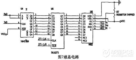 液晶顯示電路示于圖7,因為STC12C5410AD單片機的Io口有限,而1602液晶屏需要8個數(shù)據(jù)口,因此使用了一個74HC164芯片將串口的輸入轉為并口的輸出,并且加入了一個74LS273鎖存器芯片防止在串行移入的過程中將不需要的數(shù)據(jù)送入1602液晶屏,導致顯示錯誤。