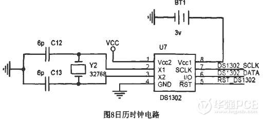 日歷時鐘電路示于圖8,采用的是Dallas公司推出的DS1302芯片,是IIC接口的芯片。STC12C5410AD單片機沒有IIC通信口,是用兩個IO口通過軟件來模擬IIC接口。DS1302_SCLK和DS1302_DATA兩個網(wǎng)絡標號連接到STC12C5410AD單片機的P2.2和P2.3口,在這兩個u上各加了一個10K的上拉電阻。RST_DS1302網(wǎng)絡標號連接到P0.0,用來復位DS1302芯片。