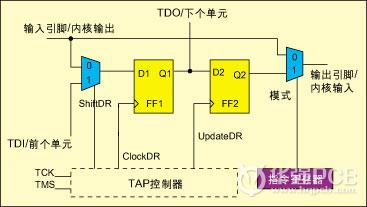 邊界掃描是一種被廣泛使用的測(cè)試技術(shù),它要求在輸入或輸出引腳和內(nèi)部?jī)?nèi)核邏輯之間配置邊界掃描單元。邊界掃描測(cè)試技術(shù)能夠高效地測(cè)試內(nèi)核邏輯和互連。圖4給出了傳統(tǒng)帶移位和更新節(jié)點(diǎn)的標(biāo)準(zhǔn)邊界掃描單元(BSC)。Mode_1使單元處于測(cè)試模式。在掃描操作中數(shù)據(jù)通過移位寄存器(Shift-DR狀態(tài))進(jìn)行移位 。通過掃描輸入端口(TDI)被掃描進(jìn)邊界掃描單元的測(cè)試模式在Update-DR狀態(tài)(UpdateDR信號(hào))下得到并行使用。連接于內(nèi)部邏輯和輸出引 腳之間的邊界掃描單元可以并行捕獲電路響應(yīng),并通過掃描輸出端口(TDO)掃描輸出。利用JTAG標(biāo)準(zhǔn)(IEEE 1149.1)可以測(cè)試互連的粘連、開路和短路等故障情況,這是通過“EXTEST”指令實(shí)現(xiàn)的,在該指令操作下TAP控制器利用BSC從互連中分離出內(nèi) 核邏輯。但這種測(cè)試的目的并不是測(cè)試互連的信號(hào)完整性。為了測(cè)試互連的信號(hào)完整性,需要對(duì)標(biāo)準(zhǔn)架構(gòu)作少許的改進(jìn)。