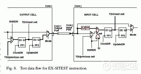 針對(duì)新的測(cè)試架構(gòu),建議在IEEE 1149.1指令集中增加一條新的指令EX-SITEST。這條指令類似于EXTEST指令,但增加了控制信號(hào)SI。在Update-IR狀態(tài),這條指令被解碼并產(chǎn)生(SI_1)。此時(shí)輸出單元用作標(biāo)準(zhǔn)BSC,而輸入單元用作OBSC。信號(hào)F在Capture-DR狀態(tài)時(shí)被捕獲,并在Shift-DR狀態(tài)期間以每個(gè)時(shí)鐘周期的速度向外移位輸出。本例中TAP控制器狀態(tài)不會(huì)改變,但在指令解碼時(shí)需要一些變化。存在于內(nèi)核之間的EX-SITEST指令的數(shù)據(jù)流如圖8所示。