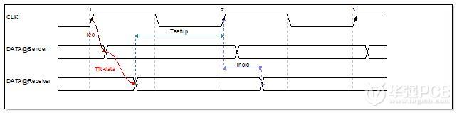分析圖2中時(shí)鐘信號(hào)和數(shù)據(jù)信號(hào)的相互關(guān)系,可以發(fā)現(xiàn):由于Tco的存在,如果器件間的時(shí)鐘和數(shù)據(jù)走線等長,則在接收端,用于發(fā)送時(shí)間的邊沿不能用于數(shù)據(jù)的采樣。為了在接收端對(duì)數(shù)據(jù)進(jìn)行正確采樣,必須調(diào)整時(shí)鐘和數(shù)據(jù)走線的關(guān)系,有兩種方法:第一,時(shí)鐘走線長于數(shù)據(jù)走線,使得數(shù)據(jù)飛行時(shí)間較時(shí)鐘短。此時(shí),在接收端仍然可以使用產(chǎn)生數(shù)據(jù)的時(shí)鐘沿采樣數(shù)據(jù);第二,數(shù)據(jù)走線比時(shí)鐘長,使得數(shù)據(jù)飛行時(shí)間較時(shí)鐘長。此時(shí),可以使用使用產(chǎn)生數(shù)據(jù)時(shí)鐘沿的下一個(gè)上升沿采樣數(shù)據(jù)。