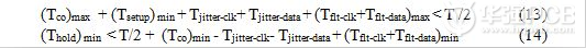 使用公式進(jìn)行計(jì)算,為簡化忽略公式(3)和公式(4)中的抖動(dòng)因素Tjitter-clk和Tjitter-data,則相關(guān)公式變?yōu)椋?/p>