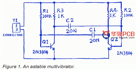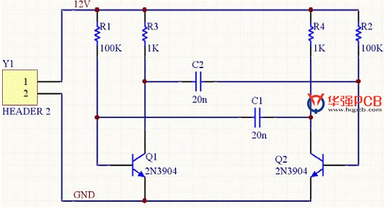 接下來可以開始畫電路原理圖。本章將使用如圖6-3所示的電路圖為例進行講解。這個電路是由兩個2N3904三極管組成的非穩(wěn)態(tài)多諧振蕩器。