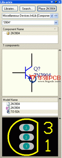 7 . 點擊Miscellaneous Devices . IntLib庫中的名為2N3904的元件并來添加它。這個庫擁有所有的可以利用于仿真的BJT三極管元件標識。