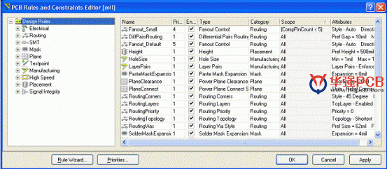 例如,一塊板可以先設(shè)置一個寬度約束規(guī)則,然后地線設(shè)定第二個寬度約束規(guī)則,某些連接地的線設(shè)定第三寬度約束規(guī)則(獨立于前兩個規(guī)則)。規(guī)則按照優(yōu)先順序顯示。