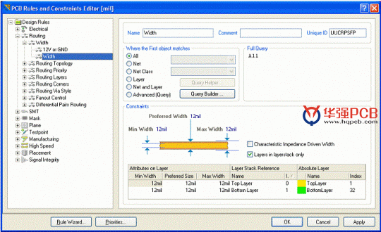 10 、最后,點擊編輯原來的規(guī)則命名寬度(范圍設(shè)定為所有),并確認Min Width, Preferred Width和Max Width都設(shè)置為了12mil。單擊OK關(guān)閉該對話框。