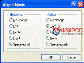 點擊右鍵并選擇Align>>Align(捷徑:A,A) 。在Align Objects對話框中,點擊Space Equally在Horizontal選項并按一下Top在Vertical選項中。四個電阻現(xiàn)在對齊并有同樣間隔。