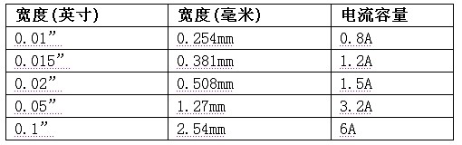 表1:外部跡線寬度與電流容量(20oC溫升)。