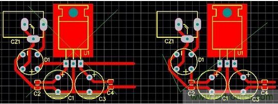 圖2是上面原理圖的PCB圖,兩個圖相似。左圖和右圖就是走線有點不一樣,左圖的電源經(jīng)整流后直接就到了穩(wěn)壓芯片的輸入腳了,然后才是穩(wěn)壓電容,這里電容所起的濾波效果就差了很多,輸出也有問題。右圖就是比較好的圖了。我們不僅要考慮正電源的流向問題,還必須考慮地回流問題,一般來說,正電源線和地回流線要盡可能同進同出,彼此離近點。