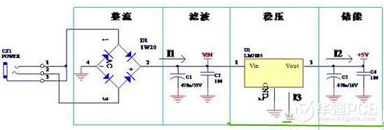 從圖上可知,線性電源有整流、濾波、穩(wěn)壓、儲能等功能元件組成,同時,一般用的線性電源為串聯(lián)穩(wěn)壓電源,輸出電流等于輸入電流,I1=I2+I3,I3是參考端,電流很小,因此I1≈I3。我們?yōu)槭裁匆v電流,是因為PCB設計時,每條線的寬度不是隨便設的,是要根據(jù)原理圖里元件節(jié)點間的電流大小來確定的(請查《PCB設計銅鉑厚度、線寬和電流關(guān)系表》)。電流大小、電流流向要搞清楚,做板才恰到好處。