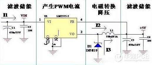 開關(guān)電源PCB設計時,需要注意的地方是:反饋線的引入點、續(xù)流二極管是給誰續(xù)流。從圖3可以看出,U1導通時,電流I2進入電感L1,電感的特性是電流在電感里流過時不能突然產(chǎn)生,也不能突然消失,電流在電感里的變化時有一個時間過程的。在脈沖電流I2流過電感的作用下,有部分電能轉(zhuǎn)換成磁能,電流逐漸增大,到一定時候,控制電路U1關(guān)斷了I2,由于電感的特性,電流不能突然消失,這時候二極管起作用了,它接替電流I2,所以叫續(xù)流二極管,可以看出,續(xù)流二極管是給電感用的,續(xù)流的電流I3是從C3的負端出發(fā),經(jīng)D1,L1后流入C3的正端,這里就相當于抽水機,利用電感的能量,把電容C3的電壓提高了。
