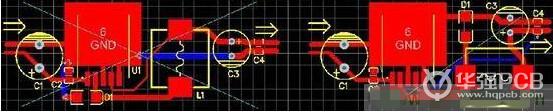 還有就是電壓檢測的反饋線引入點問題,應該是經(jīng)過濾波后的地方反饋回去,不然會使輸出的電壓紋波更大。這兩點是我們很多PCB設計人員經(jīng)常忽視的地方,以為同一個網(wǎng)絡,接在那兒不是一樣,其實接的地方不一樣,性能影響是很大的。圖4是LM2575開關(guān)電源PCB圖,大家看看錯的那幅圖是哪里錯了。
