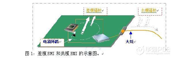 在PCB電路板中,電磁能的存在有兩種形式,即差模EMI和共模EMI。當(dāng)器件輸出的電流流入一個(gè)負(fù)載時(shí),就會(huì)產(chǎn)生差模EMI。當(dāng)電流流經(jīng)多個(gè)導(dǎo)電平面,如PCB上的導(dǎo)線組或電纜,就會(huì)產(chǎn)生共模EMI。圖1給出了差模EMI和共模EMI的示意圖。