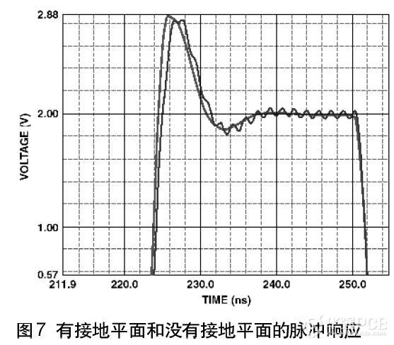 圖7中的振蕩示出了高速運算放大器同相輸入端長度為2.54 cm的印制線的影響。其等效寄生電感為29 nH(10-9H),足以造成持續(xù)的低壓振蕩,會持續(xù)到整個瞬態(tài)響應(yīng)周期。圖7還示出了如何利用接地平面來減小寄生電感的影響。
