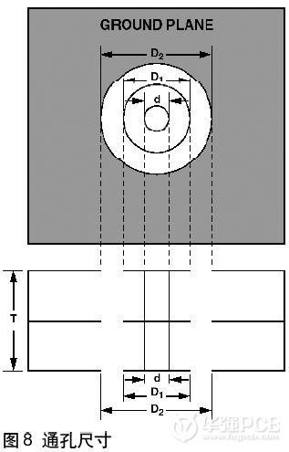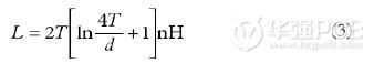 通孔是另外一種寄生源;它們能引起寄生電感和寄生電容。公式(3)是計算寄生電感的公式(參見圖8)。