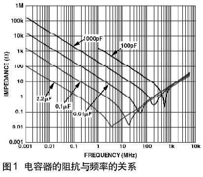 并聯(lián)不同的電容值的電容器有助于確保電源引腳在很寬的頻帶上只能看到很低的交流(AC)阻抗。這對于在運算放大器電源抑制比(PSR)衰減頻率處尤其重要。該電容器有助于補償放大器降低的PSR。在許多十倍頻程范圍內(nèi)保持低阻抗的接地通路將有助于確保有害的噪聲不能進入運算放大器。圖1示出了采用多個并聯(lián)電容器的優(yōu)點。在低頻段,大的電容器提供低阻抗的接地通路。但是一旦頻率達到了它們自身的諧振頻率,電容器的容性就會減弱,并且逐漸呈現(xiàn)出感性。這就是為什么采用多個電容器是很重要的原因:當一個電容器的頻率響應(yīng)開始下降時,另一個電容器的頻率響應(yīng)開始起作用,所以能在許多十倍頻程范圍內(nèi)保持很低的AC阻抗。