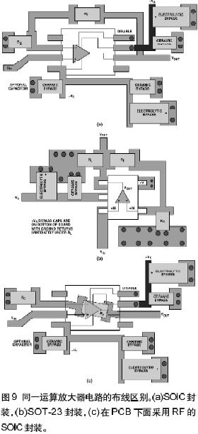 圖9示出了采用SOIC封裝(a)和SOT-23封裝(b)的運算放大器之間的布線區(qū)別。每種封裝都有它自身的一些問題。重點看(a),仔細觀察反饋路徑就發(fā)現(xiàn)有多種方法連接反饋。最重要的是保證印制線長度最短。反饋路徑中的寄生電感會引起振鈴和過沖。在圖9(a)和9(b)中,環(huán)繞放大器連接反饋路徑。圖9(c)示出了另外一種方法——在SOIC封裝下面連接反饋路徑——這樣就減小了反饋路徑的長度。每種方法都有細微的差別。第一種方法會導(dǎo)致印制線過長,會增大串聯(lián)電感。第二種方法采用了通孔,會引起寄生電容和寄生電感。在給PCB布線時必須要考慮這些寄生效應(yīng)的影響及其隱含的問題。SOT-23布線差幾乎是最理想的:反饋印制線長度最短,而且很少利用通孔;負載和旁路電容從很短的路徑返回到相同的地線連接;正電源端的電容(圖9(b)中未示出)直接放在PCB背面的負電源電容的下面。