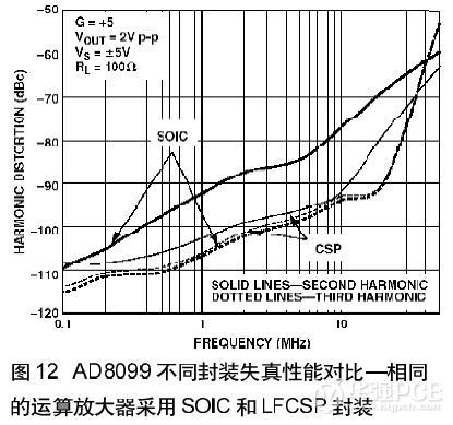 這種引腳排列還有一個好處就是降低了二次諧波失真。傳統(tǒng)運算放大器的引腳配置中引起二次諧波失真的一個原因是同相輸入和負電源引腳之間的耦合作用。LFCSP封裝的低失真引腳排列消除了這種耦合所以極大地降低了二次諧波失真;在有些情況下最多可降低14 dB。圖12示出了AD80992 采用SOIC封裝和LFCSP封裝失真性能的差別。