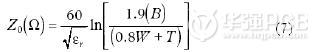 用于帶狀線的特征阻抗計算公式如公式(7)所示。