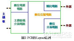 圖2是典型的印刷電路基板Layout范例,如圖所示該電路基板是復數個電路基板之中的一片,此時只要透過主機板就能夠進行信號交易。主機板執(zhí)行基板之間的數據交易時通常會有Bus通行,雖然圖2的基板主體是數字電路,不過卻混載小規(guī)模的模擬電路。