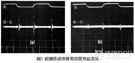 圖5是距離與旁通電容器的互動特性測試結果,圖5(a)的旁通電容器與IC的距離為10cm,圖5(b)為3cm,兩者其它條件完全相同,不過(a)與(b)的效果卻截然不同,距離為10cm時旁通電容器幾乎未發(fā)揮任何作用。
