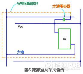 圖6的旁通電容器外觀上看似非??拷麵C,實際卻是典型的設計不當范例。旁通電容器的效果,基本上取決于電源-大地-圖案三者之間的回繞方式,雖然旁通電容器的效果非常大,不過布線的阻抗也非常重要,因此設計上通常會使用非常粗大的圖案(圖7)。