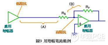 如圖9所示驅動與接收端之間插入高阻抗組件時,高阻抗組件與接收端之間的布線會變成高阻抗,此時必需縮減高阻抗部份的布線長度,加長低阻抗部份的布線長度。圖9中的接收器為反相增幅器,由于應用增幅器的輸入阻抗很高,因此電阻器RS與RF之間的(B)屬于高阻抗,換言之此時必需縮減該部位的布線長度,加長(A)部位的布線長度