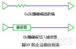 高頻噪訊(noise)不但會在信號線內部傳遞,還會透過信號線放射散播,因此單純在接收端設置濾波器,過濾連接的效果非常有限,根本對策是徹底消弭連接(圖10)。信號頻率很高時,延緩信號的站立方法容易造成信號本身遲鈍,另外一種方法是使接收端適當終結藉此消除連接,不過終結接收端時電流仍舊在流動它會消費電力,基于省能源等考慮一般都是采取驅動端終端設計方式。