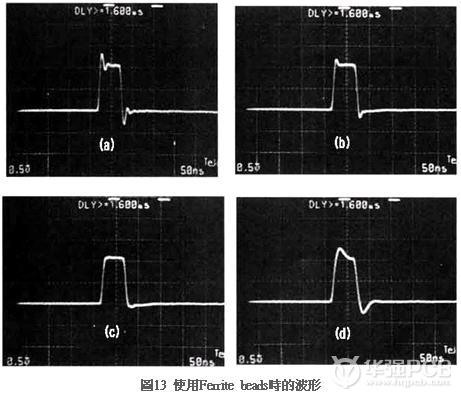 圖13是實際使用Ferrite beads時的波形,值得一提的是Ferrite beads并非連接至基板內的圖案,而是直接與接口連接。如圖所示13(a)是無Ferrite beads時的波形;圖(b)~(d)分別是逐漸增加Ferrite beads電感值時的波形。