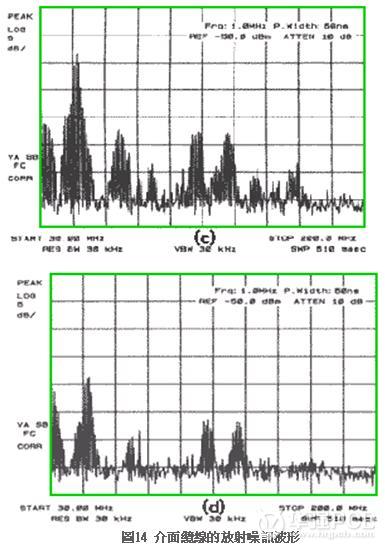 圖13(b)仍舊殘留若干連接;圖13(d)出現癱陷(sag),圖中水平部位應該呈平整狀,實際上卻是急遽下降之后略為提高,至于癱陷則是電感值過大造成的特殊現象。圖13(c)被認為最適宜的Ferrite beads。數字信號的場合,圖13(d)比較妥適,不過即使是圖13(d)的波形也不會引發(fā)誤動作。若與圖13(c)比較,信號的高頻成份反而大幅減少,其結果如圖14所示,來自信號信的放射噪訊亦隨著降低。
