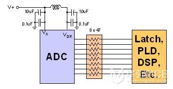 降低此類感應(yīng)噪聲的第一步,是降低數(shù)字輸出引腳的電容性負荷,這意味著應(yīng)該避免直接以ADC輸出來直接驅(qū)動總線(這就是為什么高速ADC依舊采用傳統(tǒng)的三態(tài)輸出模式的的原因)。較小的電容意味著充電時需要移動的電荷數(shù)量變少,因此而產(chǎn)生的感應(yīng)噪聲自然也變低。因此,設(shè)計中非常重要的一點是,盡量使被驅(qū)動的設(shè)備具有單一的、低電容的輸入引腳,而且該設(shè)備的輸入端應(yīng)盡可能靠近ADC的輸出引腳。