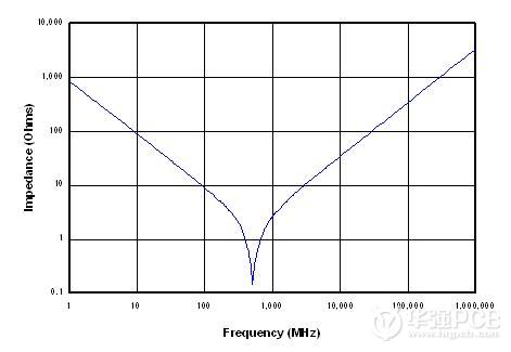 圖4: 電容器可以在很窄的頻率范圍內(nèi)旁路訊號 將這些高頻成分旁路掉的最有效方法是在電源平面和接地平面之間使用層間電容,而用于傳送電源的路徑在電源平面和接地平面之間所形成的電容太小,不能產(chǎn)生足夠的高頻旁路功能。