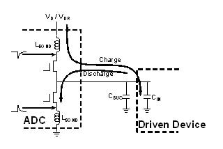 接合線的電感將旁路良好的輸出線與硅芯片隔離。當ADC的輸出引腳訊號由低向高變化時,我們可以在輸出在線觀測到負向脈波,我們稱之為“供電反彈”。如果這個輸出線用做輸出級的同時也為同一硅芯片上的其它區(qū)域所共享,這些負向脈波就會附加到這些區(qū)域的訊號上。如果該區(qū)域是數(shù)字電路,這些負向脈波會引起抖動噪聲;如果是模擬電路,這些負向脈波則會直接將噪聲引入轉(zhuǎn)換過程。