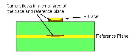 直流的回流電流會充滿整個導(dǎo)體,而交流則不然。所謂阻抗最小的通路,就是兩根電流方向相對的導(dǎo)體所產(chǎn)生的磁場相互緊密結(jié)合的部分,這也是導(dǎo)致兩根電流方向相對的導(dǎo)體電流互相靠近的原因。這使得回流平面的導(dǎo)流線被其對應(yīng)下方的反向?qū)Я骶€吸引,使他們相互靠近,就好像回流平面是一根緊靠在流出路徑下面的傳導(dǎo)回流訊號的路徑,如圖2所示。