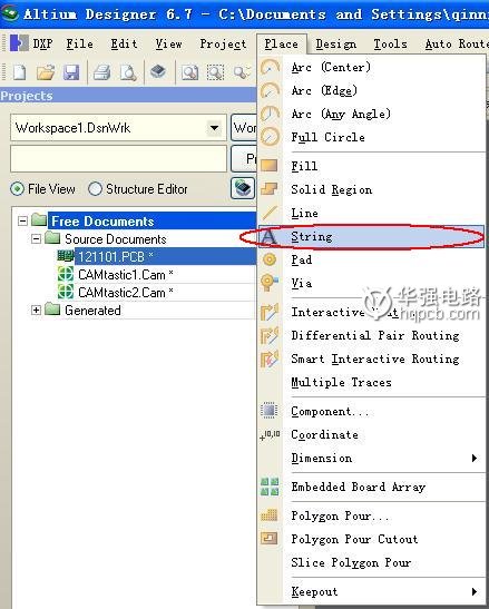 1:用Altium Designer 6打開要生成Gerber的PCB設(shè)計文件,首先設(shè)置一下字符串,在Place>