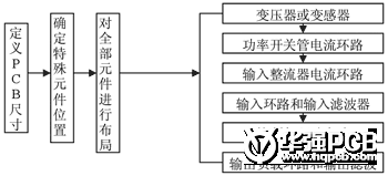 4 用屏蔽來抑制輻射及感應(yīng)干擾 開關(guān)電源干擾頻譜集中在30MHz以下的頻段,直徑r<λ/2π,主要是近場性質(zhì)的電磁場,且屬低阻抗場。可用導(dǎo)電良好的材料對電場屏蔽,而用導(dǎo)磁率高的材料對磁場屏蔽。此外,還要對變壓器、電感器、功率器件等采取有效的屏蔽措施。屏蔽外殼上的通風(fēng)孔最好為圓形,在滿足通風(fēng)的條件下,孔的數(shù)量可以多,每個孔的尺寸要盡可能小。接縫處要焊接,以保證電磁的連續(xù)性。屏蔽外殼的引入、引出線處要采取濾波措施。對于電場屏蔽,屏蔽外殼一定要接地。對于磁場屏蔽,屏蔽外殼不需接地。 5 合理的PCB布局及布線 敏感線路主要是指控制電路和直接與干擾測量設(shè)備相連的線路。要降低干擾水平,最簡單的方法就是增大干擾源與敏感線路的間距。但由于受電源尺寸的限制,單純的增大間距并非解決問題的最佳途徑,更為合理的方法是根據(jù)干擾電場的分布情況將敏感線路放在干擾較弱的地方。PCB抗干擾布局設(shè)計流程如圖6所示。