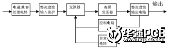 開關(guān)電源因體積小、功率因數(shù)較大等優(yōu)點,在通信、控制、計算機(jī)等領(lǐng)域應(yīng)用廣泛。但由于會產(chǎn)生電磁干擾,其進(jìn)一步的應(yīng)用受到一定程度上的限制。本文將分析開關(guān)電源電磁干擾的各種產(chǎn)生機(jī)理,并在其基礎(chǔ)之上,提出開關(guān)電源的電磁兼容設(shè)計方法。 開關(guān)電源的電磁干擾分析 開關(guān)電源的結(jié)構(gòu)如圖1所示。首先將工頻交流整流為直流,再逆變?yōu)楦哳l,最后再經(jīng)整流濾波電路輸出,得到穩(wěn)定的直流電壓。電路設(shè)計及布局不合理、機(jī)械振動、接地不良等都會形成內(nèi)部電磁干擾。同時,變壓器的漏感和輸出二極管的反向恢復(fù)電流造成的尖峰,也是潛在的強(qiáng)干擾源。