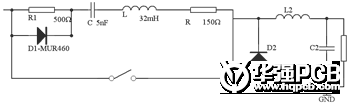 2 減小干擾源干擾能量的緩沖電路 在開關(guān)控制電源的輸入部分加入緩沖電路(見圖3),其由線性阻抗穩(wěn)定網(wǎng)絡(luò)組成,用于消除電力線干擾、電快速瞬變、電涌、電壓高低變化和電力線諧波等潛在的干擾。緩沖電路器件參數(shù)為D1為MUR460,R1=500Ω,C=6nF,L=36mH,R=150Ω。