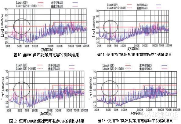 圖10~圖13是改變上述電容容量時的EMI噪訊測試結(jié)果,根據(jù)測試結(jié)果顯示,依照圖14的頻率范圍設(shè)置的大容量EMI噪訊對策用電容DuF,可以抑制低頻噪訊Level。雖然設(shè)置電容增加PCB的容量負載,不過為了要抑制噪訊,設(shè)置在各部位的電容頻率特性,卻可以發(fā)揮預(yù)期的EMI噪訊抑制效果。