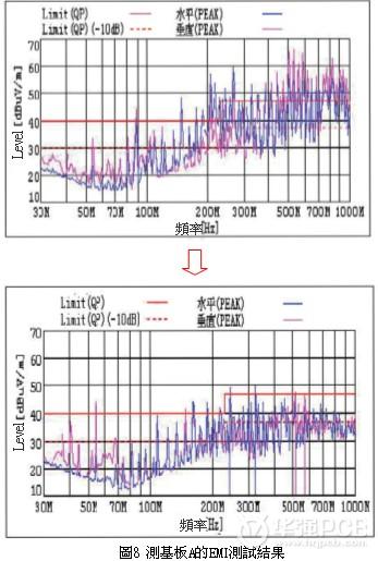 實際制作PCB時在基板側(cè)面鋪設(shè)Shield,同樣會面臨成本上升的質(zhì)疑,類似圖23在基板側(cè)面附近設(shè)置接地Plane與連續(xù)性貫穿Via的新結(jié)構(gòu),除了可是解決成本問題之外,還可以有效抑制基板側(cè)面的EMI噪訊強度;圖24是結(jié)合以上各種EMI噪訊對策的PCB測試結(jié)果。