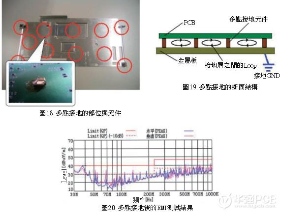 Return電流流動時PCB內(nèi)的接地Plane會產(chǎn)生電位差,該電位差往往是EMI噪訊的發(fā)生原因之一,而且可能會通過PCB形成所謂的二次噪訊,因此將接地Plane與金屬板作多點連接(圖18、圖19),使PCB的側(cè)面與中心位置得電位差均勻化,同時降低接地Plane本身的阻抗(Impedance)并抑制電壓下降。