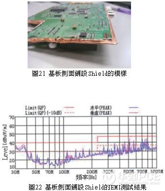 圖21是在基板側(cè)面鋪設(shè)Shield的實際外觀,具體方法是在基板側(cè)面粘貼導電膠帶,試圖藉此抑制基板內(nèi)層信號線、Via與電源Plane的噪訊,接著再與外層接地Plane連接,測試基板側(cè)面的EMI噪訊遮蔽效果,圖22是基板側(cè)面鋪設(shè)Shield的EMI測試結(jié)果,根據(jù)測試結(jié)果顯示200MHz以下時EMI噪訊強度有下降趨勢,甚至符合規(guī)范的Level,證實基板側(cè)面鋪設(shè)Shield確實可以抑制EMI噪訊。
