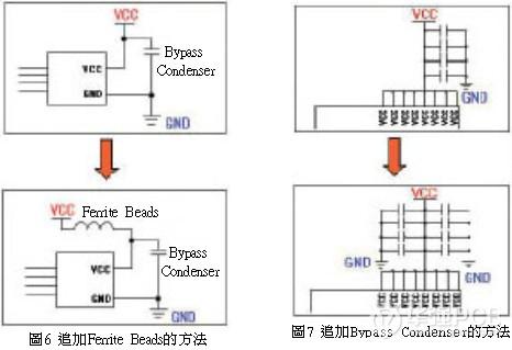 ?各IC電源輸入線的Bypass Condenser與電源之間,追加設(shè)置Ferrite Beads(圖6)。