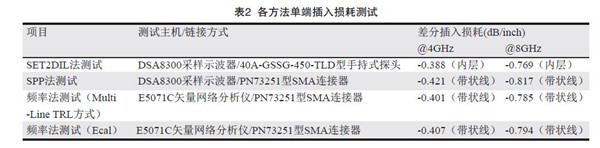 3 測(cè)試設(shè)備及測(cè)試結(jié)果 采用介電常數(shù)3.8、介質(zhì)損耗0.008、RTF銅箔的CCL分別制作SET2DIL測(cè)試板、SPP測(cè)試板和Multi-Line TRL測(cè)試板;測(cè)試設(shè)備為DSA8300采樣示波器和E5071C矢量網(wǎng)絡(luò)分析儀;各方法差分插入損耗測(cè)試結(jié)果如表2所示。